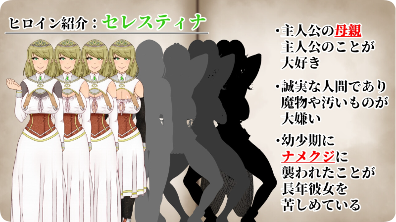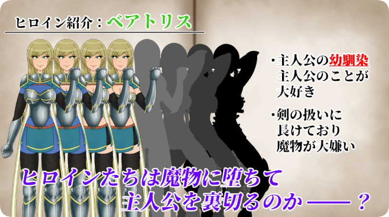 这是一款以奇幻世界为背景的NTR题材RPG,主人公最重要的母亲和青梅竹马将逐渐被各种异种族夺走。